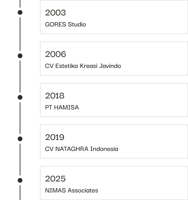 Berawal sebagai GORES Studio pada 17 Agustus 2003, perjalanan kami telah melalui berbagai transformasi signifikan, mengukuhkan komitmen pada keunggulan desain dan pembangunan. Kini, sebagai NIMAS Associates, kami menghadirkan solusi terintegrasi melalui dua pilar utama: Molten Architect Studio, tim konsultan arsitek visioner yang membentuk ide menjadi desain luar biasa, dan Nataghra Indonesia, kontraktor pelaksana yang menjamin eksekusi presisi dan kualitas tak tertandingi. Dengan lebih dari dua dekade pengalaman kolektif, kami siap menjadi mitra terpercaya Anda dari konsep hingga realisasi.